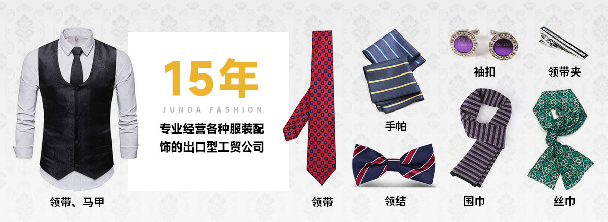 上饒市駿達(dá)服飾有限公司是一家專(zhuān)業(yè)經(jīng)營(yíng)各種服裝配飾的出口型工貿(mào)公司,公司多年來(lái)致力各種男女服裝國(guó)際流行配飾的開(kāi)發(fā)和生產(chǎn),主要產(chǎn)品為領(lǐng)帶、領(lǐng)結(jié)、絲巾、圍巾、手帕、馬甲、背心、箱包皮具、領(lǐng)帶夾、袖扣等,有豐富的內(nèi)外銷(xiāo)經(jīng)驗(yàn)及廣泛的國(guó)內(nèi)外銷(xiāo)售渠道,生產(chǎn)基地管理嚴(yán)格,質(zhì)量過(guò)硬,并有一批生產(chǎn)加工企業(yè)長(zhǎng)期合作
